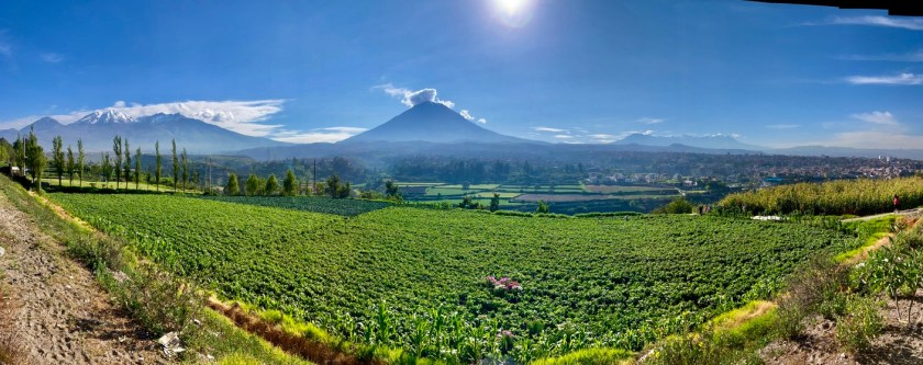 Panoramic view of the three volcanic peaks east and northeast of Arequipa—Chancani, Misti, and Picchu Picchu in the distance on the right