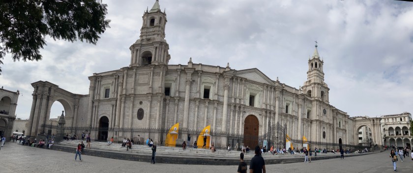 Basilica Cathedral of Arequipa on the Plaza de Armas—originally started in 1544, destyoyed by an earthquake in 1583, rebuilt in 1509 and again in 1609, and finally completed in 1950.