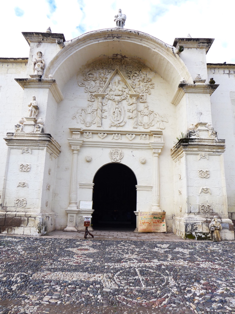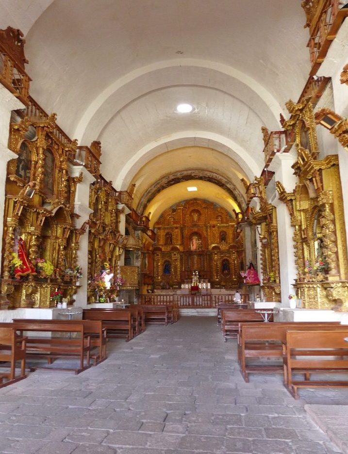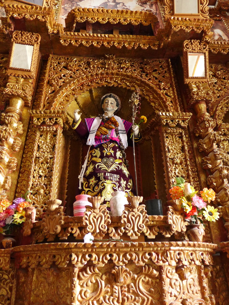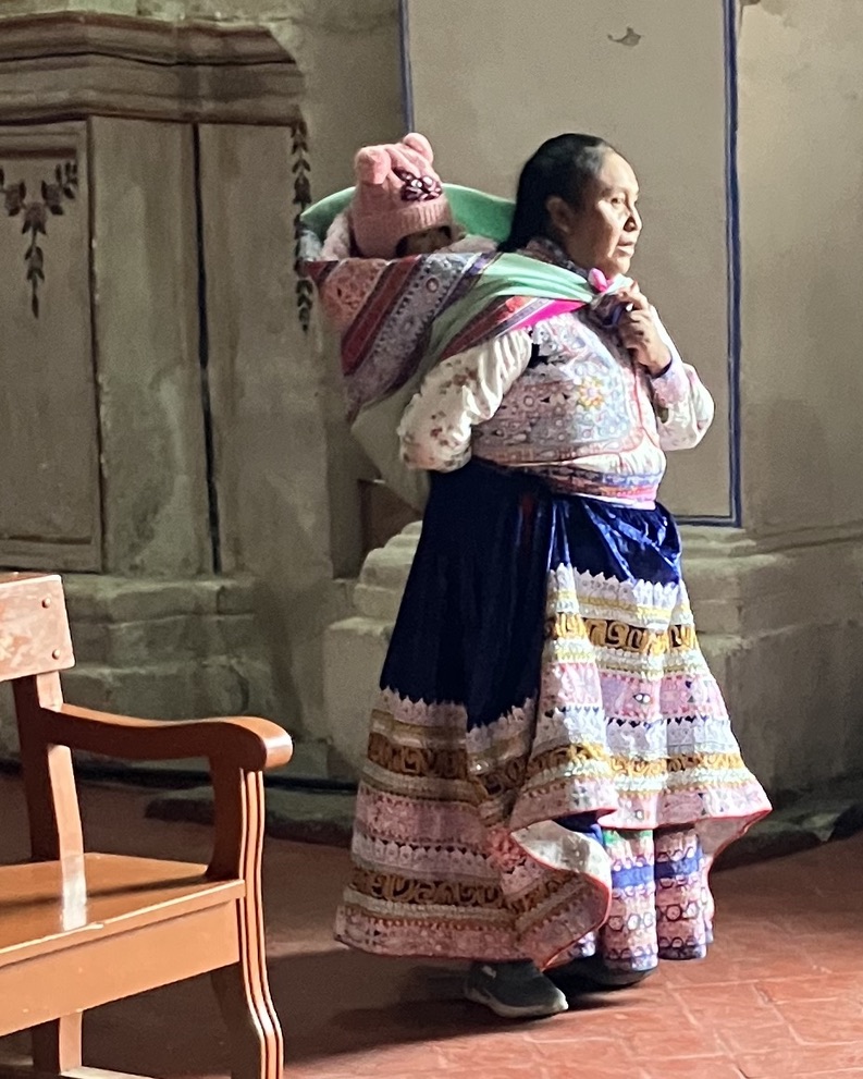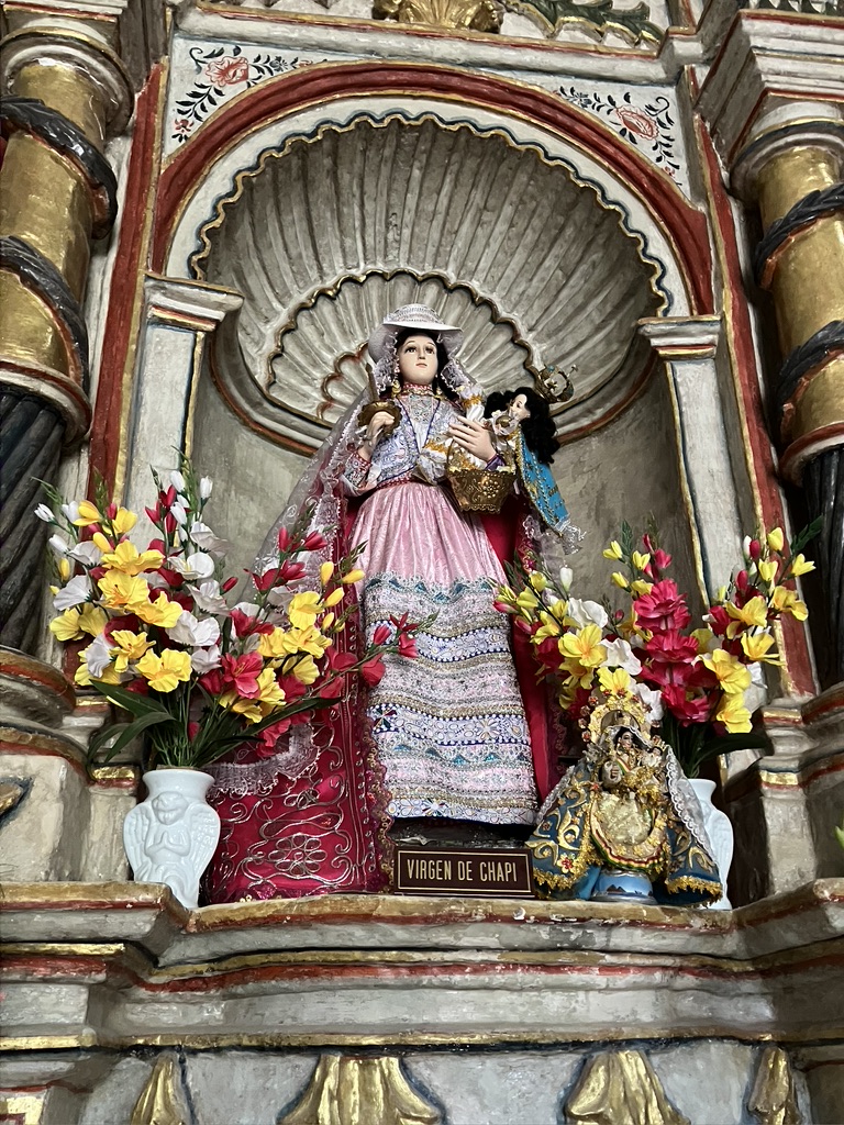Note the similarities between how a local woman visiting the church is dressed and how she carries her child and the statue of La Virgen de Chapi—The Virgin of Chapi—also known as Our Lady of Candelaria of Chapi (Nuestra Señora de la Candelaria de Chapi), the patron saint of the province of Arequipa.
