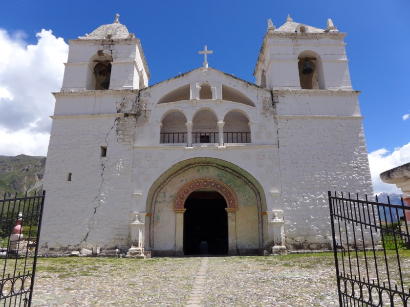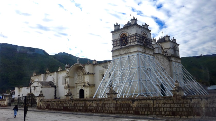 Iglesia Inmaculada Concepción de Yanque or Iglesia de Achoma—Catholic church on the south side of the central plaza—reinforcement scaffolding in the long, slow process of restoration