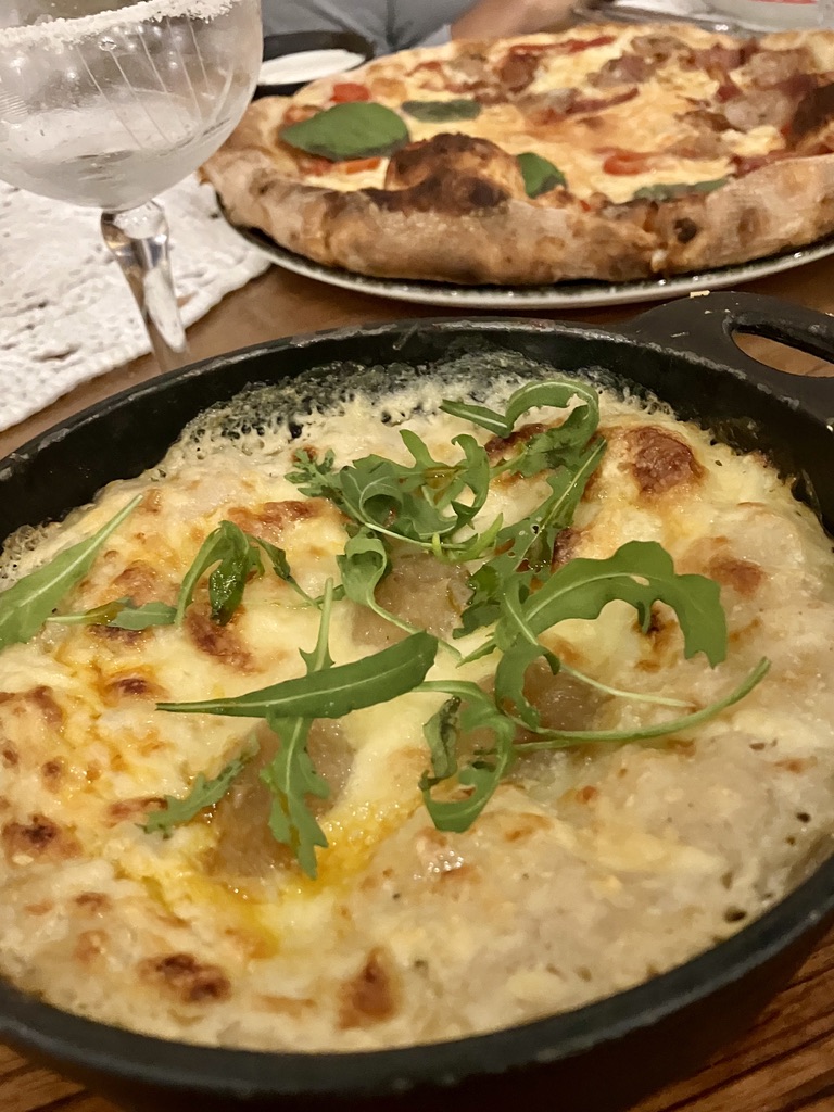 Fine wines, Margaritas, Pisco sours, cervezas, pizza, salad and potato contorni (side dishes) at Restaurante Mumis near the Plaza de Armas in central Arequipa